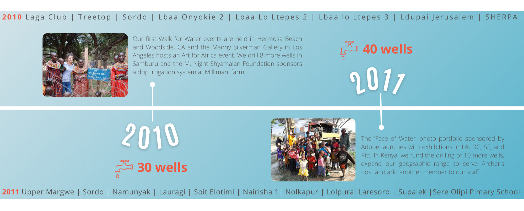 As we continue through our history, we reach 2010 and 2011, when The Samburu Project scaled significantly. During this period, we drilled eighteen new wells, six of which have since been replaced by our dedicated team, and four of which that are no longer working due to external factors. In total, we brought clean, reliable water to more than 8,850 people during this time. Since then, we’ve deepened our investment in the social fabric of these communities, leading five Menstrual Hygiene Management workshops, hosting three Samburu Sisters women’s empowerment workshops, launching a solarization initiative, and cultivating a community garden project. Each effort strengthened not only access to water but opportunities for education, health, and economic growth.